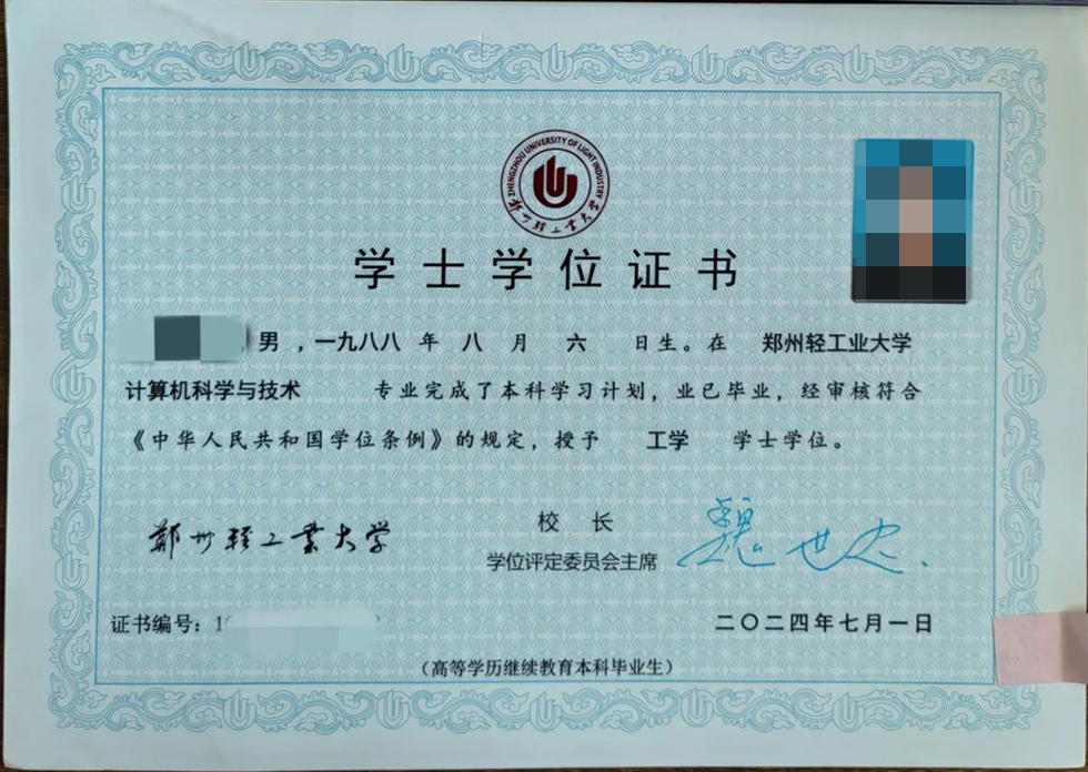 五、2025年郑州轻工业大学成人高考学位证书模版