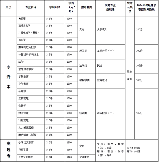 河南师范大学成人高考的招生共有两种层次, 专升本以及高起专,学制都是2.5年,但是每学期的学费因为层次以及类别的不同,学费也有所不同,各位考生可以先参考24年河南师范大学成人高考招生专业及学费: