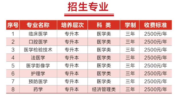 2025年新乡医学院成人高考的招生专业还没有公布,各位考生可以先参考2024年的招生情况,具体招生专业如下图(包含学费情况)