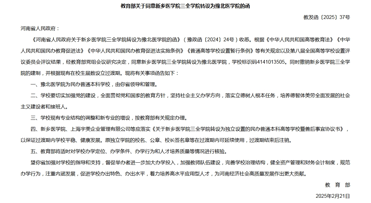 3月17日,教育部官网发布了“教育部关于同意设置武汉职业技术大学的函”“教育部关于同意设置长沙科技学院的函”等7个通知,同意设置武汉职业技术大学、长沙科技学院、郑州健康学院,同意山西医科大学晋祠学院转设为晋中健康学院、同意新乡医学院三全学院转设为豫北医学院的函,同意湖南理工学院南湖学院转设为岳阳学院,同意湖南文理学院芙蓉学院转设为常德学院。