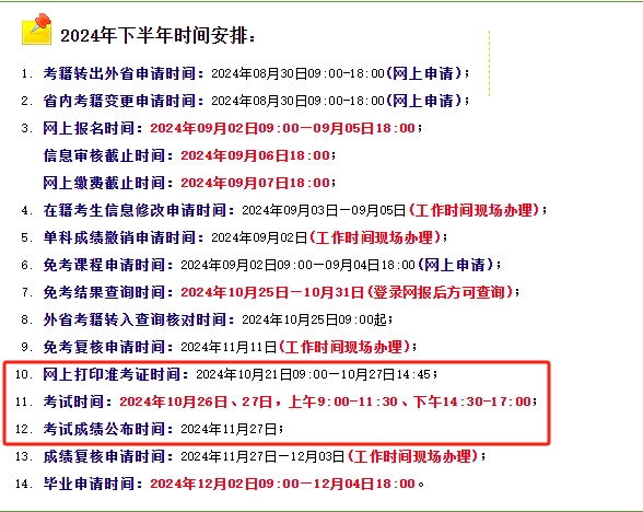 2024年下半年河南自考本科考试时间已经有明确的公告了,在2024年10月26日-2024年10月27日这两天。